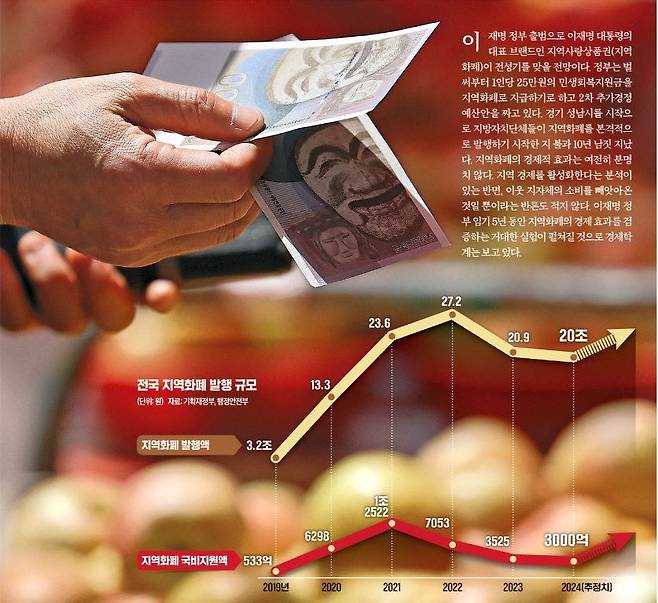 2016년 이재명 당시 성남시장은 청년 배당, 산후조리비 등을 지역화폐인 ‘성남사랑상품권’으로 지급해 지역 내 소비를 유도했다. 성남시의 실험이 성과를 거두면서 지역화폐는 전국으로 확산했다. 문재인 대통령 때인 2020년에는 ‘지역사랑상품권 이용 활성화에 관한 법률’이 제정돼 제도적 지원을 위한 법적 근거까지 마련됐다. 2018년 66곳, 3714억원이던 발행 지자체 수와 발행 규모는 2024년 190곳, 20조원으로 급증했다.