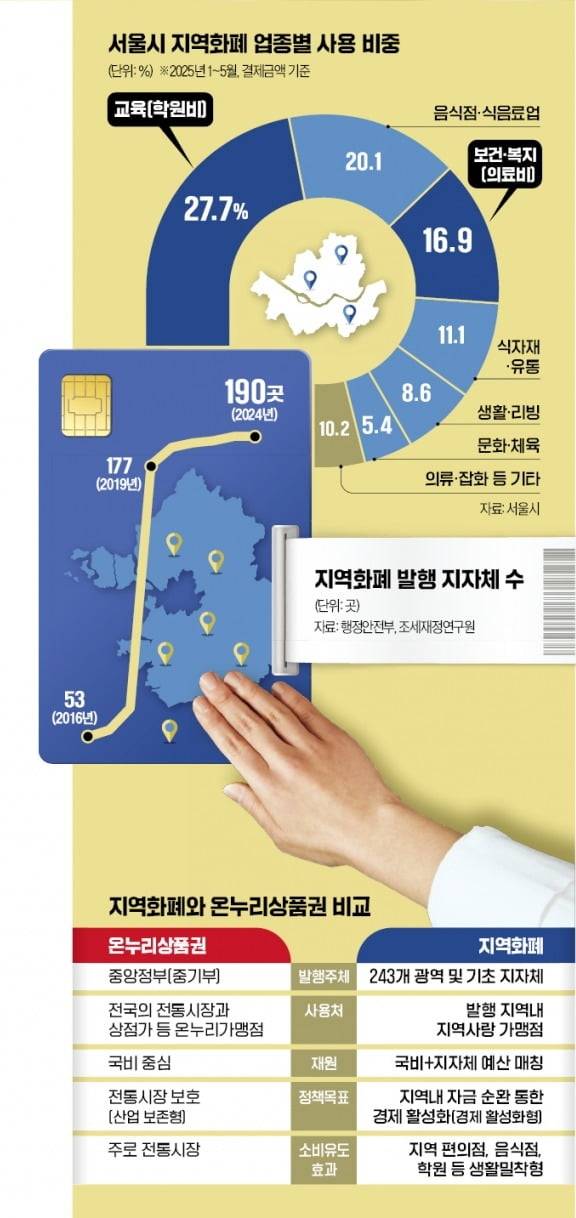 지역 경제를 의미 있게 살찌우는지에 대해서도 이견이 많다. 지역화폐 대부분이 학원비와 병원비에 쓰여 기존 소비를 대체하고, 사교육과 과잉 진료를 부추긴다는 우려가 제기된다. 올해 1~5월 서울시 지역화폐 사용액 4886억원 가운데 학원비(교육)와 병원비가 차지하는 비중이 2176억원으로 45%에 달했다. 시장가격보다 싼값을 받고서라도 지역화폐를 현금화하는 ‘현금깡’ 문제도 끊이지 않는다.