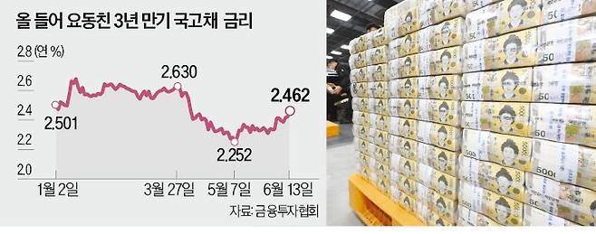 채권시장은 이번주 이창용 한국은행 총재의 ‘매파적’(통화긴축 선호) 발언 영향을 받을 것으로 전망된다. 이날 3년 만기 국고채 금리는 전날보다 0.033%포인트 오른 연 2.462%에 거래를 마쳤다. 5년 만기 금리와 2년 만기 금리는 각각 0.016%포인트, 0.043%포인트 상승해 연 2.597%, 연 2.466%에 장을 마쳤다.