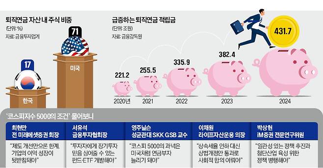 최현만 전 미래에셋증권 회장은 “국민연금은 규모가 감소하는 만큼 앞으로 국내 주식시장 지분을 줄여갈 수밖에 없다”며 “퇴직연금이 이를 대체해야 한다”고 설명했다. 월가에서 15년간 투자 전문가로 일한 영주닐슨 성균관대 SKK GSB 교수는 “코스피지수 5000 시대의 과녁은 미국처럼 연금부자 늘리기가 돼야 한다”며 “직장인을 증시로 끌어들이려면 한국 증시가 성장할 것이란 기대를 심어주는 게 가장 중요하다”고 말했다.
