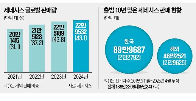 정의선 현대자동차그룹 회장의 고급화 전략에 따라 2015년 현대차에서 독립 브랜드로 분리해 출범한 제네시스는 글로벌 프리미엄차 시장에서 전례 없는 성장세를 이어왔다. 2019년 7만7135대이던 제네시스 글로벌 판매량이 지난해 22만9532대로 5년 새 두 배(197.6%) 급증했다.