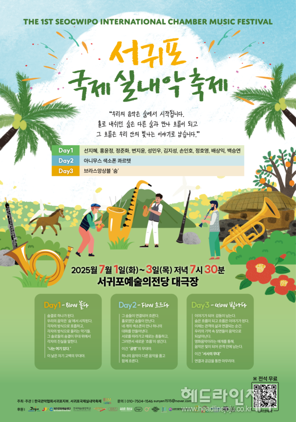 김동수 한국관악협회 회장은 "서귀포에서 처음 열리는 국제 실내악 축제를 통해 관악기의 섬세한 숨결과 실내악의 깊이가 관객들에게 닿길 바라며, 아울러 예술이 일상에 스며드는 서귀포가 되길 바란다"고 전했다. <헤드라인제주>