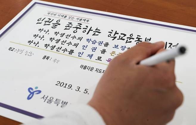 | ▲ 2019년 3월 5일 서울 서초구 서울시교육연수원에서 열린 인권을 존중하는 학교운동부 비전 선포식에서 참석자들이 아름다운 지도자 서약식에 서명하고 있다. |
