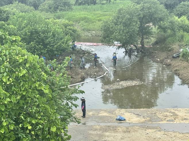 현장에 투입된 한 작업자는 "기름 제거용 종이를 쓰고 있어 유류 유출 같다"며 "점성이 강해 닦아도 잘 지워지지 않는다"고 말했다. 방제작업을 지켜보던 시민들도 "하천에 기름이 흘러든 것 아니냐"고 우려했다.