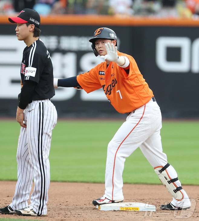 (대전=뉴스1) 김기남 기자 = 15일 대전 한화생명볼파크에서 열린 프로야구 '2025 신한 SOL 뱅크 KBO리그' 한화이글스 대 LG트윈스 경기에서 한화 이도윤이 4회 1,2루에서 안타를 치며 2타점을 올리고 있다. 2025.6.15/뉴스1