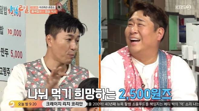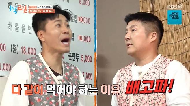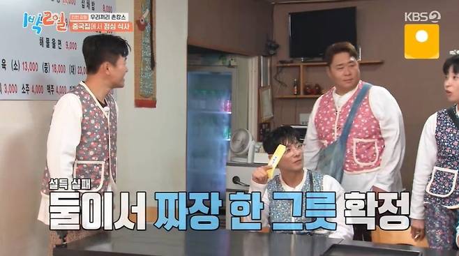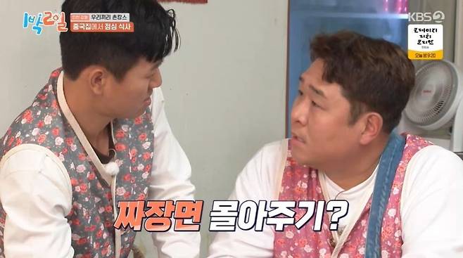 조세호는 김종민에게 "게임에서 이겼는데 왜 같이 먹어야 하는지 설득을 해봐라"라고 기회를 줬지만, 김종민은 그저 "배고파"라고만 말했다. 결국 둘이서 짜장 한 그릇을 먹게 된 상황. 이에 문세윤과 김종민은 한 명에게 짜장면을 몰아주기로 했다. 다른 멤버들이 짬뽕, 탕수육 등을 시켜 맛있게 먹는 사이 문세윤은 "내일도 영업하시죠? 내일 먹으면 더 맛있다"라고 긍정 회로를 돌렸다.
