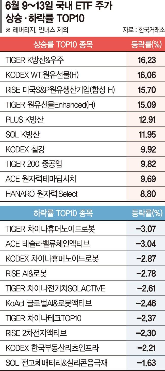 TIGER K방산&우주를 필두로 방산 ETF인 'PLUS K방산'(12.91%)과 'SOL K방산'(11.95%)도 모두 10% 이상 상승했다. 한화에어로스페이스, 현대로템, LIG넥스원 등이 주로 편입된 이들 ETF는 최근 중동의 지정학적 긴장이 높아지면서 상승흐름을 보이고 있다.