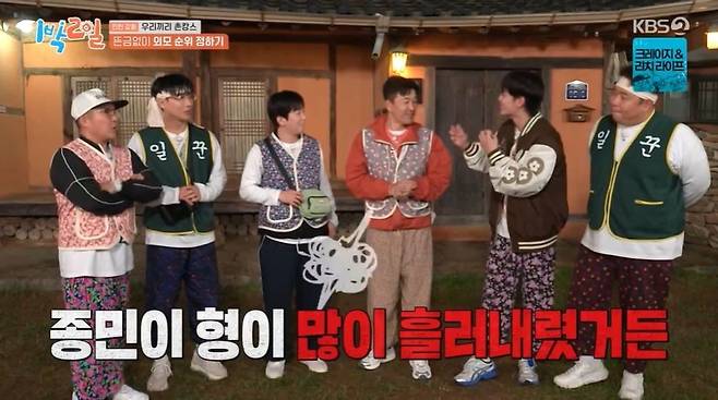 15일 방송된 KBS2 '1박 2일 시즌4'에서는 김종민, 문세윤, 딘딘, 유선호, 조세호, 이준이 촌캉스를 떠난 모습이 그려졌다.