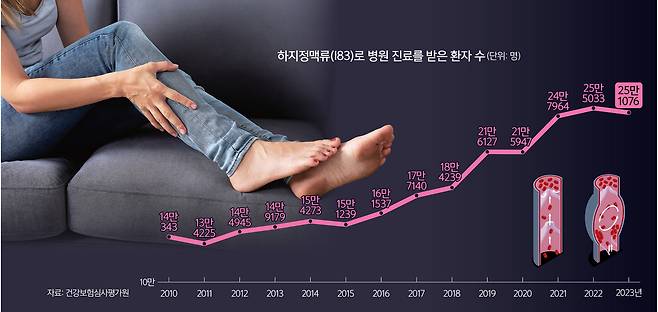 하지정맥류 환자 수는 증가 추세다. 건강보험심사평가원에 따르면 2011년 14만343명이던 환자 수는 2023년 25만1076명으로 79% 증가했다. 특히 여름철에는 기온이 오르면서 혈관이 확장돼 다리에 머무는 혈액이 많아지고 다리에 가해지는 압박도 커져 증상이 악화해 환자 수가 더 많아지게 된다.