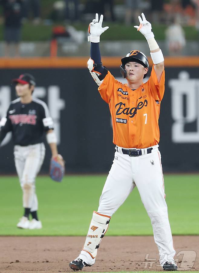 (대전=뉴스1) 김기남 기자 = 15일 대전 한화생명볼파크에서 열린 프로야구 '2025 신한 SOL 뱅크 KBO리그' 한화이글스 대 LG트윈스 경기에서 5회말 우천으로 경기 중단 후 다시 재개된 가운데 한화 이도윤이 1타점 2루타를 치고 있다. 2025.6.15/뉴스1