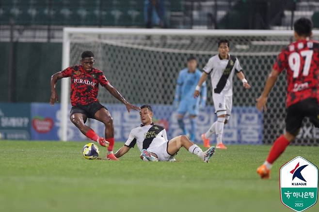 김포가 마침내 득점에 성공했다. 27분 코너킥 상황에서 최필수가 펀칭으로 막았다. 최재훈의 오른발 발리슈팅은 수비 맞고 나왔다. 이 볼은 홀로 있던 디자우마에게 흘렀고, 디자우마는 침착한 왼발 슈팅으로 마무리했다.