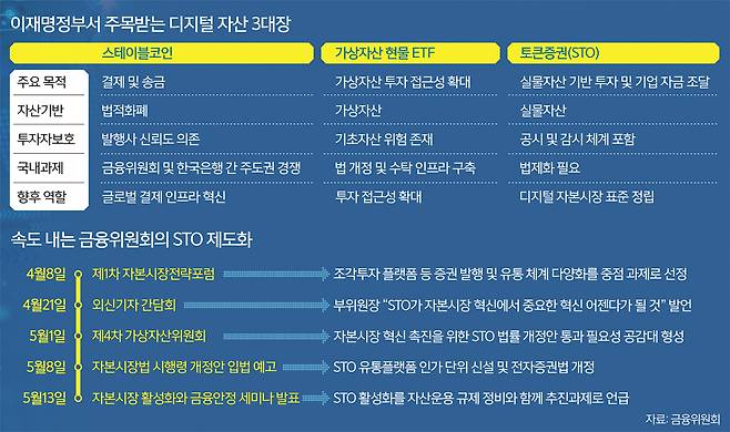 원화기반 스테이블코인과 가상자산 현물 상장지수펀드(ETF), 토큰증권(STO) 등 국내 디지털 자산 시장이 이재명정부의 출범과 함께 들썩이고 있다. 특히 가상자산 투자자들을 비롯해 사업자들은 이재명정부에서 진행 중인 디지털 자산 관련 법제화에 촉각을 곤두세우고 있다. 법제화와 지원책 선후에 따라 관련 업계의 희비가 엇갈리기 때문이다. 하지만 이들 디지털 자산은 각자 다른 역할과 목적, 제도적 특성을 보이는 만큼 법제화 속도에도 차이를 보일 것으로 전망된다. 특히 STO의 경우 국회와 금융당국의 이견이 없어 최근 최우선 법제화 대상으로 급부상하고 있다.