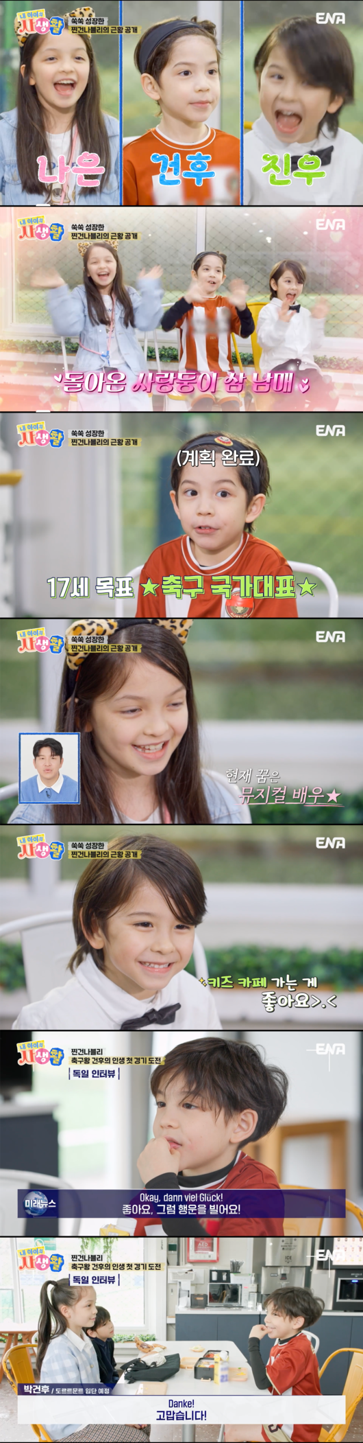15일 오후 방송된 ENA ‘내 아이의 사생활’(이하 ‘내생활’)에서는 축구 선수 출신 해설자 박주호의 세 자녀 나은, 건후, 진우의 폭풍 성장한 근황이 공개됐다.