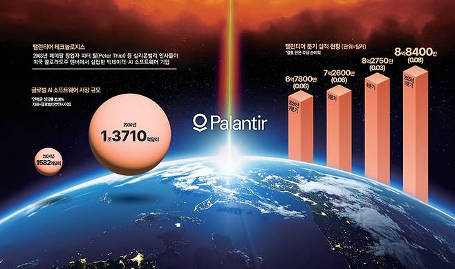 2002년 틸은 페이팔을 이베이에 15억달러(약 1조7000억원)에 매각했고, 그때 번 돈으로 창업한 회사가 팰런티어입니다. 일론 머스크 테슬라 CEO가 페이팔을 매각해 번 돈으로 스페이스X를 창업한 것과 비슷하죠. 이들이 괜히 ‘페이팔 마피아’로 불리는 게 아닙니다. 틸은 2001년 9·11 테러를 경험한 뒤 어떻게 테러를 예측할 수 있을까 고민했고, 데이터로 테러를 예측해보겠다는 계획이 창업의 동기가 됐습니다. 미국 중앙정보국 CIA가 만든 벤처캐피털인 인큐텔(IQT)이 팰런티어에 자금을 댔죠. CIA를 비롯해 미국 연방수사국(FBI)과 국가안보국(NSA), 국방부, 영국 비밀정보국(SIS) 등이 주요 정부 고객이고요. JP모건을 비롯해 크라이슬러, 에어버스 등이 팰런티어의 민간 고객사입니다. 틸의 저서 ‘제로 투 원’에서처럼 독보적인 기술로 독점적인 시장을 만드는 회사가 되기 위해 회사 인력 4000명의 대부분이 개발자 등 연구개발 인력입니다. 전체 임직원 중 세일즈 인력은 3~4% 수준밖에 되지 않는 것으로 전해집니다.