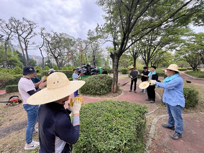 이번 작업은 조경 미관 개선과 식물 생장 관리를 위해 진행됐으며 별도의 외부 용역 없이 예상원 이사장과 이기봉 상임이사를 포함한 직원 10여 명이 직접 참여해 이뤄졌다.