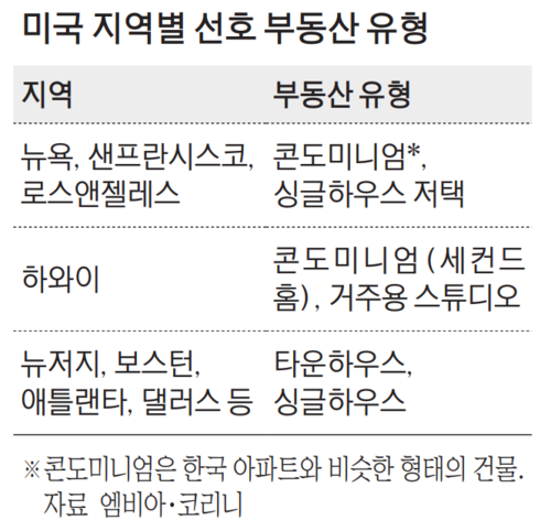 해외 부동산 업계에 따르면 미국 현지 투자는 뉴욕·샌프란시스코 등 대도시권이 인기가 많다. 유학생이 많이 상주하고, 사업 교류가 많은 미국 특성이 반영된 결과다. 문태영 코리니 대표는 “대도시는 콘도미니엄(한국 아파트와 비슷한 형태의 공동주택) 수요가 많고, 뉴저지나 보스턴 등은 타운하우스 인기가 높다”며 “하와이 같은 휴양지는 세컨드홈으로 활용 가능한 스튜디오를 찾는 사람도 꽤 많다”고 밝혔다.