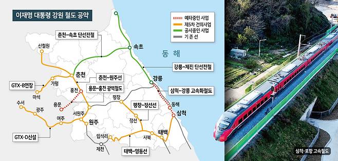 15일 본지 취재를 종합하면, 이재명 대통령은 제21대 대선에서 강원 SOC 공약 철도 부문으로 △춘천원주선 △태백영동선 △평창정선선 △GTX-B 춘천연장 △GTX-D 원주신설 △용문~홍천 광역철도 △동해선 삼척~강릉 고속화 △춘천~속초 동서고속화철도 △동해북부선 강릉~제진 등 총 9개 사업을 제시했다.