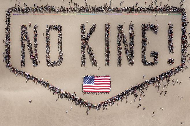 | “미국에 왕은 없다”… 美전역 동시다발 집회 14일(현지 시간) 미국 샌프란시스코 오션비치에서 시민들이 모래사장 위에서 ‘노 킹(No King·왕은 없다)’ 문구를 나타내며, 도널드 트럼프 행정부 반대 시위를 벌이고 있다. 트럼프 대통령의 79번째 생일이기도 한 이날, 미국 2000여 곳에서 시위가 열린 것으로 추산된다. 샌프란시스코=AP 뉴시스 |