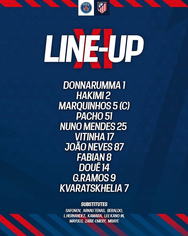 '첫판부터 빅매치' PSG-ATM, 선발 명단 공개...이강인 벤치서 경기 시작