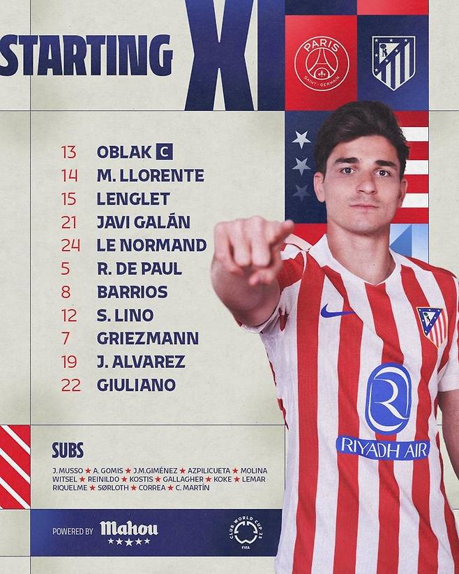 이에 맞서는 ATM은 앙투안 그리즈만, 훌리안 알바레즈, 사무엘 리누, 파블로 바리오스, 호드리고 데 파울, 줄리아노 시메오네, 하비 갈란, 클레망 랑글레, 로뱅 르 노르망, 마르코스 요렌테, 골키퍼 얀 오블락이 선발 명단에 포함됐다.