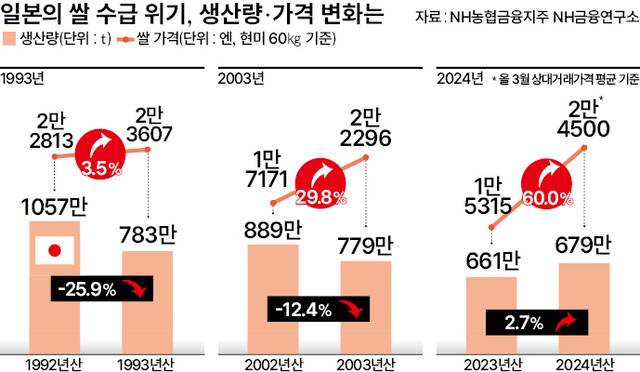 일본은 지난 30년간 세차례 쌀 수급 위기를 겪었다. 1993년에는 생산량이 25.9% 감소하자 가격이 3.5% 올랐고, 2003년에는 생산량이 12.4% 줄며 가격이 29.8% 상승했다.