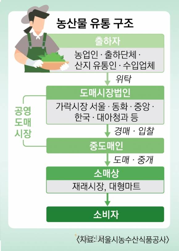산지 농산물은 이처럼 ‘출하자(농민·출하단체·산지유통인)-도매시장법인-중도매인-소매상(대형마트·재래시장)-소비자’ 단계를 거쳐 식탁에 오른다. 산지에서 도매시장법인에 판매를 위탁하면, 법인은 경매를 통해 중도매인에게 물량을 넘긴다. 도매법인은 경매가 끝나면 판매 대금에서 수수료를 떼고 곧바로 출하자에게 값을 치른다. 그러면 중도매인이 재래시장과 슈퍼마켓 등 소매상과 이마트·홈플러스·롯데마트 등 대형마트, 식자재 업체와 대형 음식점에 판매한다.