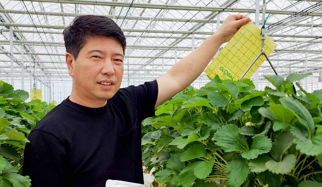 그는 5950㎡(1800평) 규모 유리온실에서 딸기를 재배하고, 3만3058㎡(1만평) 논에서 벼농사를 지으며 동오그룹 제품 14종을 쓴다. 경농의 ‘마이트킹’ ‘캡틴’ ‘벨스모’ ‘모스피란’ ‘퀸텍’ ‘벨리스에스’ ‘푸사리언’, 시그닛의 복합환경제어기·양액기·에어포그가 대표적이다. 글로벌아그로의 끈끈이 트랩과 수정벌, 조비의 ‘시설관주특호’ ‘치요다’가 그가 사용하는 제품이다.