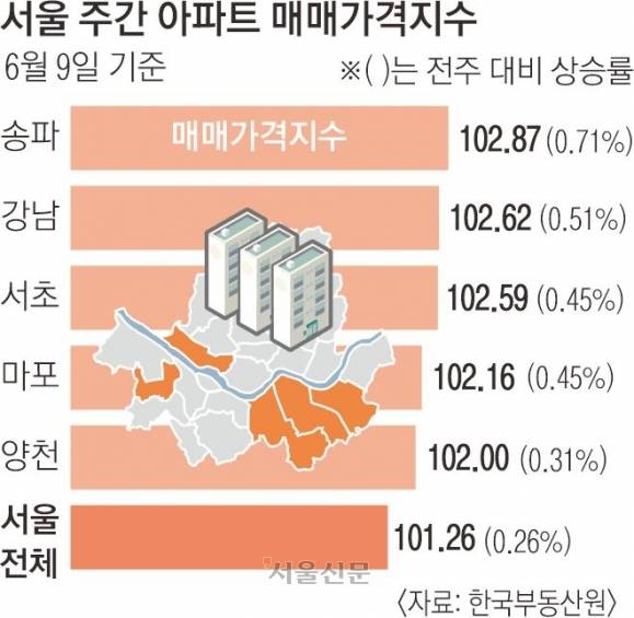 15일 한국부동산원에 따르면 서울 강남·서초·송파·마포·용산·성동·양천 7개 구 아파트값이 매주 고가를 새로 쓰고 있다. 이 중 가장 최근의 전고점을 돌파한 지역은 마포다. 5월 넷째 주 아파트 매매가격지수가 101.4로 2022년 1월의 전고점(101.29)을 넘어섰고 이달 둘째 주(6월 9일 기준)에는 102.16으로 전주보다 0.45% 상승했다. 양천구는 마포구보다 앞선 5월 둘째 주(100.83)에 전고점(100.73·2022년 1월)을 돌파했다. 강남 3구와 성동구 아파트값은 ‘불장’이던 지난해 여름 이미 전고점을 회복한 뒤 상승세(0.45~0.71%)를 이어 가고 있다. 용산구 역시 지난해 10월 전고점을 넘어섰다.
