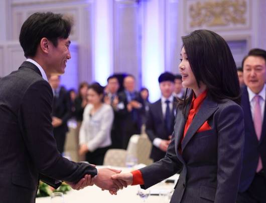 윤석열 대통령과 김건희 여사가 이날 청와대 영빈관에서 열린 복지·노동 현장 종사자 초청 오찬에 참석해 참석자들을 격려하고 인사를 나눴다. 이 가운데 당시 대통령실 홈페이지에는 윤 대통령이 연설하는 장면만 사진으로 게시되고 참석자들과의 악수나 교류를 담은 사진은 김 여사의 모습만 올라왔다는 주장이 제기돼 잡음이 일었다. 사진=대통령실 제공
