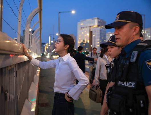 김건희 여사가 이날 '세계 자살 예방의 날'을 맞아 비공개 일정으로 119특수구조단 뚝섬 수난구조대, 한강경찰대 망원 치안센터, 용강지구대를 각각 방문해 피자·치킨 등 간식을 전달하고 구조 현장을 살폈다. 이 가운데 마포대교에서 마포경찰서 용강지구대 근무자와 함께 순찰 및 지시하는 듯한 김 여사의 사진이 공개됐고, 다음날 국회 행정안전위원회 국정감사에서 당시 교통 통제가 있었다는 자료가 나와 논란이 됐다. 더불어민주당 한민수 대변인은 12일 "김건희 여사는 자신을 대한민국 대통령이라고 착각하고 있는 것이냐"고 비판했다. 다만, 국민의힘 정광재 대변인은 "대통령 부인의 이런 비정치적 행보, 또 따뜻한 메시지를 줄 수 있는 이런 행보에 대해서는 그렇게 비난 강도를 높일 필요는 없다고 생각한다"고 반박하기도 했다. 사진=대통령실 제공