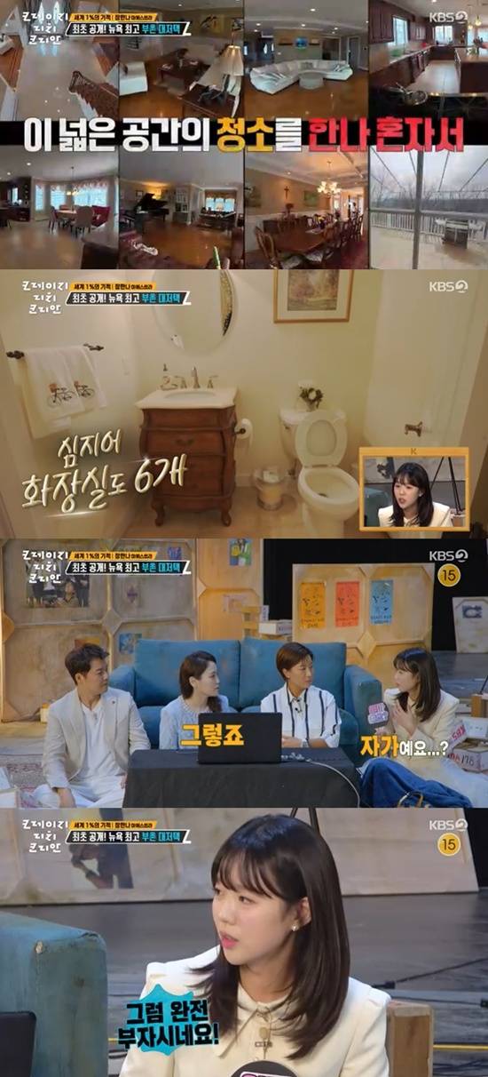 심지어 화장실만 6개라고. 장한나는 "제가 쓰는 화장실만 3개다"라고 이야기했다. 또 그는 "여름에만 쓰는 침실, 겨울에는 쓰는 침실이 따로 있다"고 했다. 이에 다른 기간엔 게스트룸으로도 그 방을 쓰지 않는 건지 궁금해하자, "게스트룸도 따로 있다"고 이야기했다.