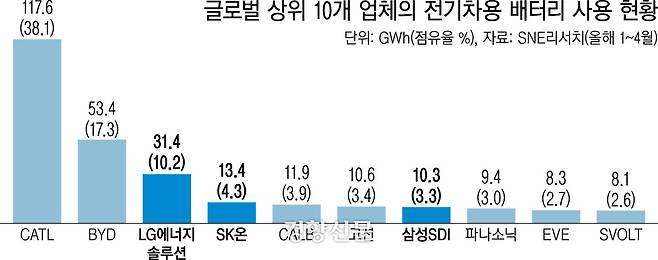 에너지 시장조사 전문기관 SNE리서치에 따르면, 올해 1~4월 LG에너지솔루션·SK온·삼성SDI 등 국내 배터리 3사의 글로벌 전기차용 배터리 사용량 시장 점유율은 전년 동기 대비 4.6%포인트 하락한 17.8%를 기록했다. 2022년에만 해도 24%였던 이들 3사의 점유율은 지난해 18.4%로 떨어진 데 이어 계속 내림세다.