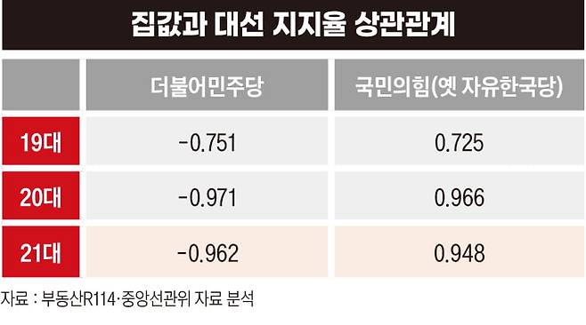 서울 아파트값이 투표성향을 결정했다...상관계수는 완벽한 일치 뜻하는 1에 육박[아파트 정치①]
