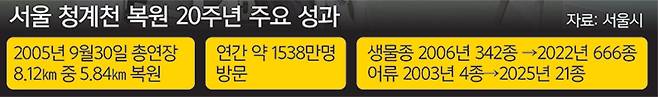 시는 청계천 복원 20주년을 기념해 11일 국제 콘퍼런스를 개최해 물 순환과 수변 공간을 통한 도시 회복력 강화 방안을 논의했다. 청계폭포에서 광통교에 이르는 청계천 상류 구간은 22일까지 시민들에게 개방한다. 정성국 시 물순환안전국장은 “청계천이 지난 20년간 도시의 품격을 성공적으로 높인 경험을 바탕으로, 수변감성도시 정책을 통해 서울 전역의 물길을 시민들 삶과 더 긴밀히 연결하고 있다”며 “서울을 세계적인 수변도시로 만들어 나가겠다”고 말했다.