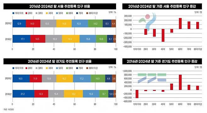 또 하나의 포인트는 서울의 인구 유출이다. 지난해에만 서울 인구는 약 9만여 명 줄었다. 이들 상당수가 경기도로 빠져 나갔다. 경기도 60대 인구는 2016년 약 111만 명에서 2024년 말 기준 191만 명으로 80만 명 증가했다. 주민등록인구에서 차지하는 비중도 8.7%에서 14.0%로 크게 높아졌다. 경기도 평균연령은 43.6세로 서울보다 낮다. 신도시가 많은 지역 특성상 10대 이하 미성년 인구가 많지만 1990년대부터 꾸준히 1기, 2기 신도시에 자리 잡은 당시 30~40대들도 고령화하고 있다. 은퇴한 50대, 60대 유입도 많다.