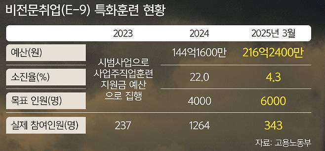 1분기까지 참여 근로자는 343명, 예산 소진율은 4.3%에 불과하다. 이대로면 올해도 목표(6000명) 달성은 요원할 수밖에 없다. 고용부는 특화훈련에 참여를 망설이는 곳이 많은 것으로 파악하고 있다. E-9 근로자를 채용하는 중소기업의 경우 즉시 투입할 인력이 필요해 채용한 건데 교육 기간에 발생하는 인력 공백을 감수하기 쉽지 않다는 것이다.