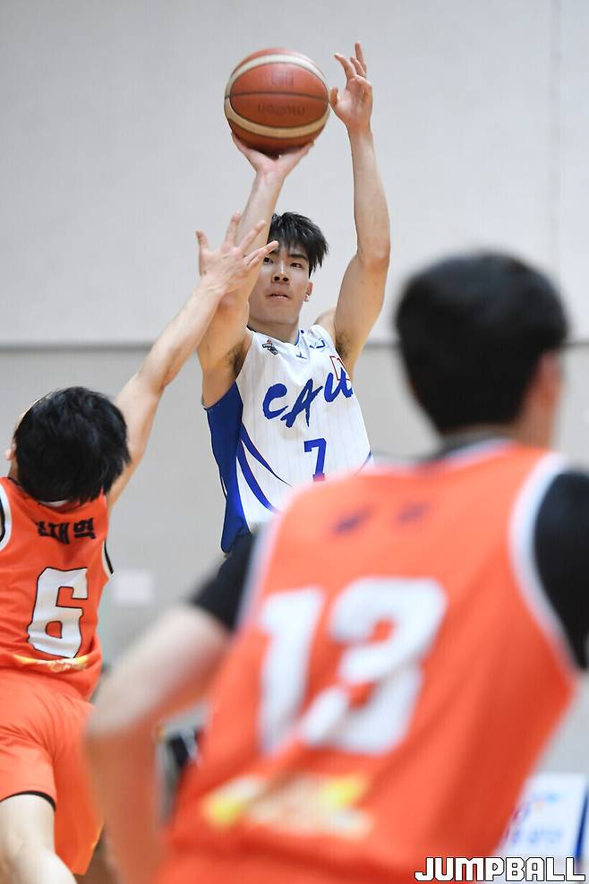 중앙대가 정세영(21득점)과 고찬유(19득점)의 외곽포를 앞세워 동국대를 제압했다. 두 24학번 동기는 팀의 75득점 중 40점을 합작했다. 중앙대는 6승 4패로 공동 4위를 지켰다. 중앙대의 1쿼터 출발이 좋았다. 정세영의 12득점 등 23점을 넣는 동안 14점만 줬다. 그러나 3점 슛을 앞세운 동국대 화력에 2쿼터는 10-25로 밀렸다. 33-39로 2쿼터 종료.