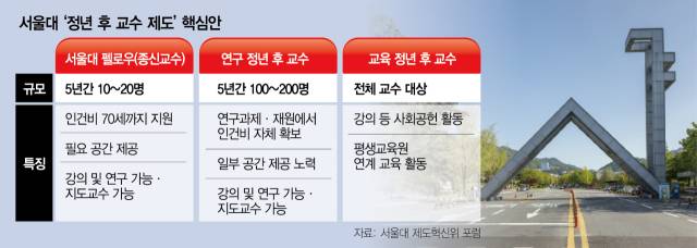 서울대가 이번에 마련한 정년 후 교수 제도는 △서울대 펠로우(종신교수) △연구 정년 후 교수 △교육 정년 후 교수로 나눠진다. 이 가운데 석좌교수급인 종신교수는 5년간 총 10~20명을 선발해 평생 종신교수 자격을 부여한다. 인건비는 70세까지 월 200~300만 원을 지급하고 학교와 협의해 필요 공간을 제공받고 강의와 연구는 물론 대학원생의 학업을 지도하는 지도교수가 될 수도 있다.