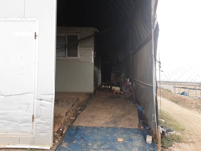| ▲ 농장 임시주거시설 내부 농장 기숙사 안쪽 모습. 열린 문 사이로 비닐하우스 안에 조립식 패널로 만든 숙소가 보인다. 네팔에서 온 A는 이와 비슷한 기숙사에서 9년 가까이 살았다. |