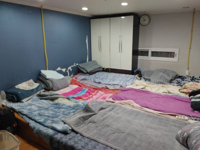 | ▲ '지구인의 정류장' 남성 이주노동자 숙소 '지구인의 정류장' 사무실 한편에 남성 이주노동자 숙소가 있다. 일을 그만두거나 갈 데가 없는 남성 이주노동자들이 이곳을 쉼터로 쓰고 있다. 사무실 곳곳에 이주노동자들의 짐들이 있다. 김이찬 감독은 사무실이 난민촌처럼 되었다고 했다. |