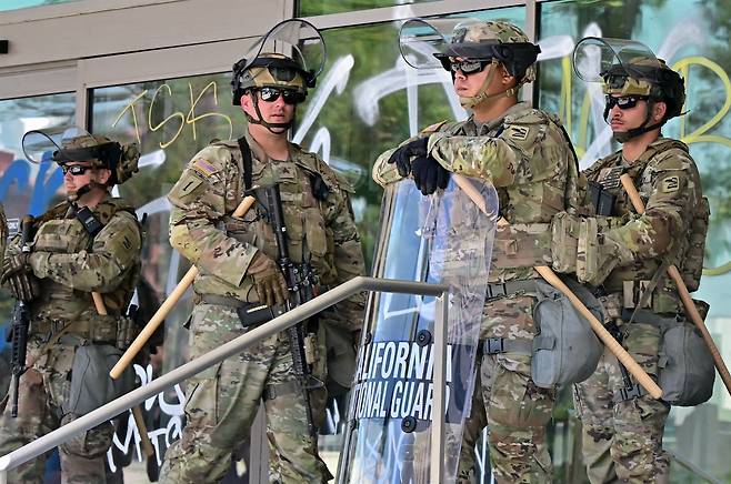 | ▲ 지난 10일 미국 로스엔젤레스에서 이민 단속에 반대하는 시위가 계속되는 가운데 연방 정부 건물 앞에 캘리포니아 주 방위군 대원들이 서 있는 모습. |