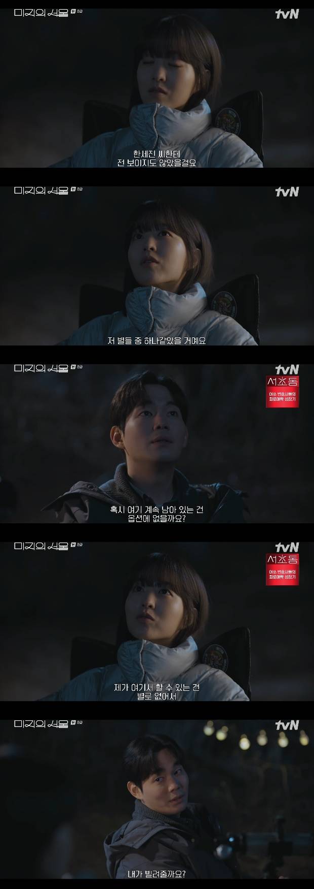 유미래는 "저 별들이 서울에도 있다는 거 아니냐"라고 물었고, 한세진은 "어두울 때 잘 보이는 게 있더라"라고 대답했다.