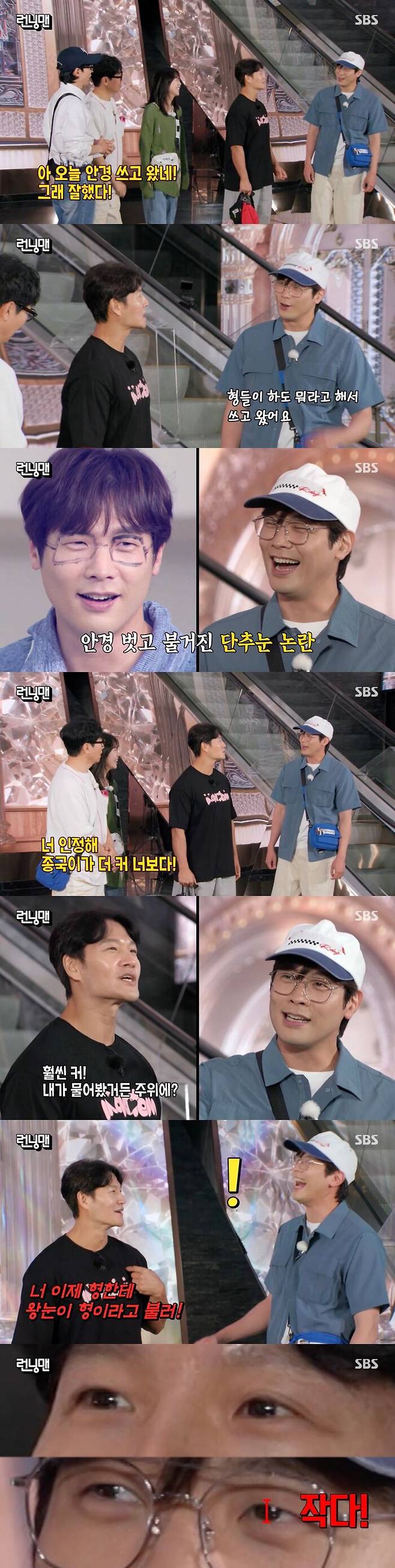 그러자 김종국은 "이제 형은 왕눈이 형이라고 불러라. 핸드폰 번호도 왕눈이형으로 저장해"라며 "그리고 얘는 눈이 좀 옹졸하다"라고 디스를 이어갔다.