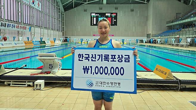 이은지는 어제(15일) 광주광역시 남부대학교 시립 국제수영장에서 열린 제4회 광주 전국수영선수권대회 여자 일반부 혼계영 400m 결승에서 배영 구간을 59초56에 주파해 한국 신기록을 수립했습니다.