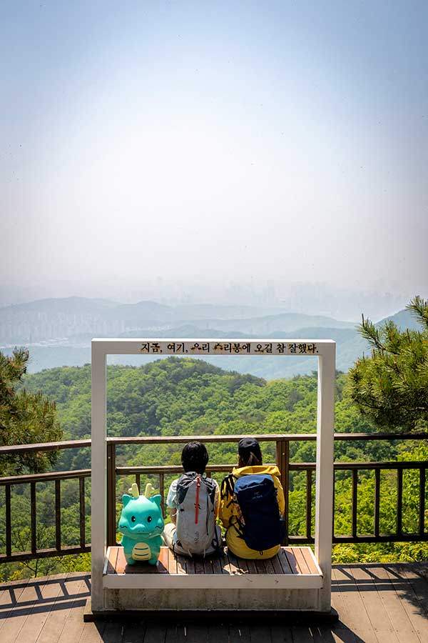 10분 걸어 도착한 광교산 정상에는 전망데크와 함께 포토존이 준비되어 있다. 용인시의 마스코트인 조아용과 함께 사진을 찍고 서둘러 다음 산으로 움직였다.