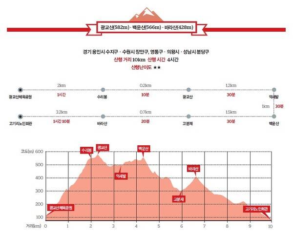 '수광 환종주'를 소개한다. 용인 수지구 기점, 광교산을 원점회귀하는 10km 종주다. 광교산체육공원을 들머리로 광교산, 백운산, 바라산을 지나 고기리로 하산한다. 깔끔하게 그려지는 동그라미 궤적이 당일 산행으로 완벽한 코스를 만든다. 대중교통으로의 접근성이 비교적 좋으며 원점회귀할 수 있는 광교산체육공원에 무료 주차장이 있다는 점이 큰 장점이다.
