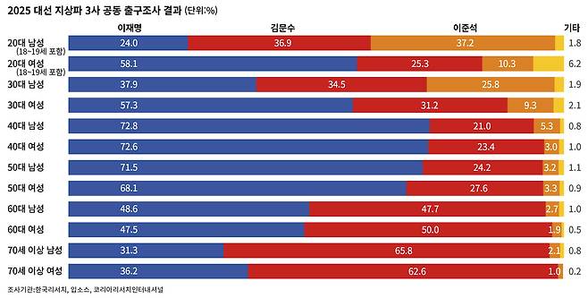 이번 대선 결과에서 주목받은 또 한 가지는 세대별·성별 투표 경향이다. 지상파 3사의 공동 출구조사 결과, 20대 남성(18~19세 포함)의 37.2%가 이준석 개혁신당 후보를, 36.9%가 김문수 국민의힘 후보를 뽑은 것으로 예측됐다. 이재명 민주당 후보에게 투표한 비율은 24%에 그쳤다. 반면 20대 여성(18~19세 포함)의 58.1%는 이재명 후보를 뽑았으며, 김문수 후보는 25.3%, 이준석 후보는 10.3%가 뽑은 데 이어 권영국 후보에게 5.9%가 투표했다(권영국 후보 포함 ‘기타’는 6.2%). 30대 남성의 경우 이재명 37.9%, 김문수 34.5%, 이준석 25.8%, 권영국 1.6% 순이었다. 30대 여성은 이재명 57.3%, 김문수 31.2%, 이준석 9.3%, 권영국 2.1% 순이다.