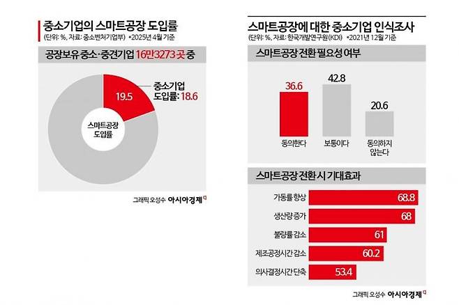 스마트공장 도입의 필요성에 대한 인식 자체는 낮지 않다. 2021년 한국개발연구원(KDI)의 '스마트팩토리(공장)에 대한 중소기업 인식조사'에 따르면 중소기업의 36.6%는 스마트공장 전환 필요성에 '동의한다'고 답했다. '보통이다'는 42.8%, '동의하지 않는다'는 20.6%로 가장 적었다. 생산량 증가(68.0%), 가동률 향상(68.8%), 불량률 감소(61.0%) 등 기대 효과도 분명히 인식하고 있다.
