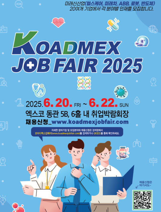 미래 신산업 분야 취업박람회인 'KOADMEX JOB FAIR(코아디멕스 잡페어) 2025'는 전시회기간 상시 운영된다. 삼보모터스, 대동, 인더텍, 인성메디칼, 신라시스템 등 20여개 알짜기업들이 취업준비생과 만나 잡인터뷰를 진행한다. 잡페어 행사장에는 일반 관람객도 즐길 수 있는 경품 이벤트 등의 다양한 프로그램이 마련돼 있다.