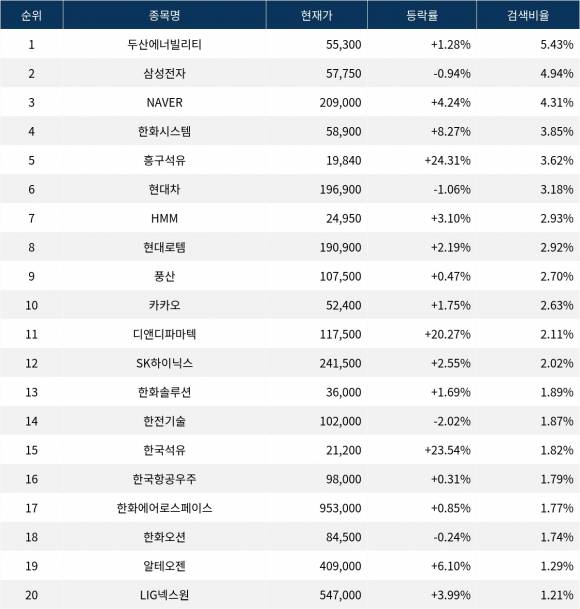 이어 삼성전자(005930)가 검색비율 2위를 기록하며 -0.94%의 등락률을 보이고 있다. 검색비율 3위의 NAVER(035420)는 4.24% 상승하며 순조롭게 출발하는 모습이다. 검색비율 4위 한화시스템(272210)은 개장 초반부터 8.27%의 상승률을 기록하고 있다. 검색비율 5위 흥구석유(024060)는 24.31%의 폭등세를 보이고 있다.